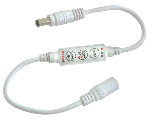 In-line low voltage single colour LED tape controller with 3 button control for dimming and internal sequence programs. Convenient DC jack input and output connections in a compact and easy-to-use format.