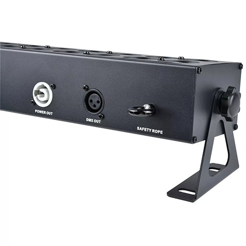 LED beam and effects bar with 48 high output RGBA LEDs to provide colour washes and moving patterns against walls, ceilings or even across floors. 2 rows of 24 LEDs can be controlled by auto or sound activated modes from preset internal colour sequences. Alternatively, in manual mode, the bar can be set to static colours or operated remotely by DMX in various channel modes. Supplied with tilt-adjustable brackets for mounting to a wall or ceiling.